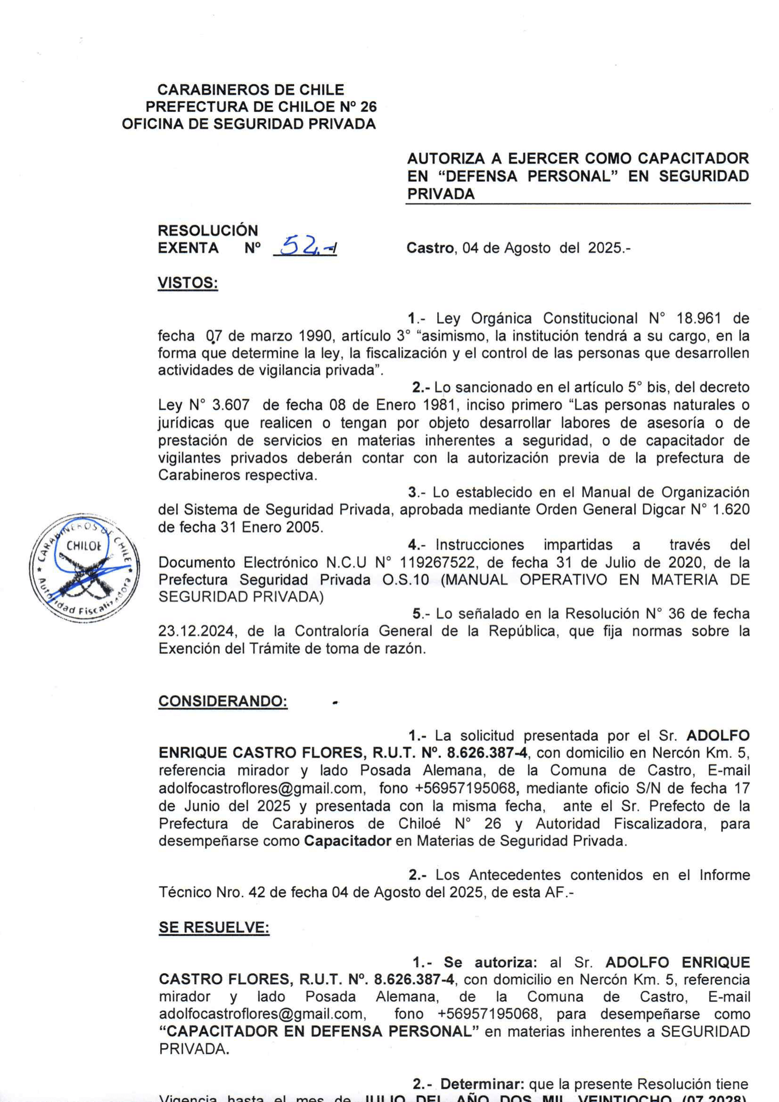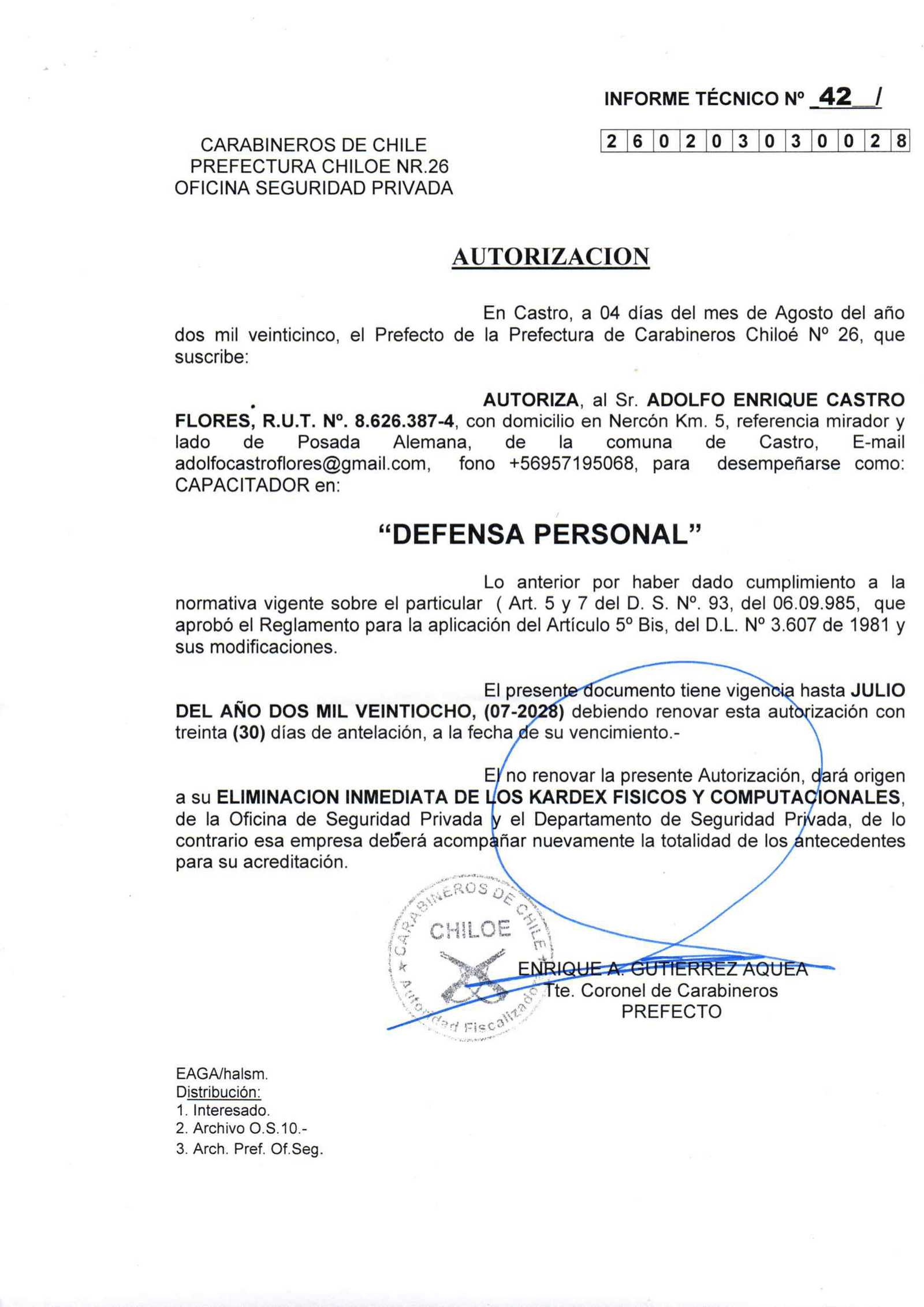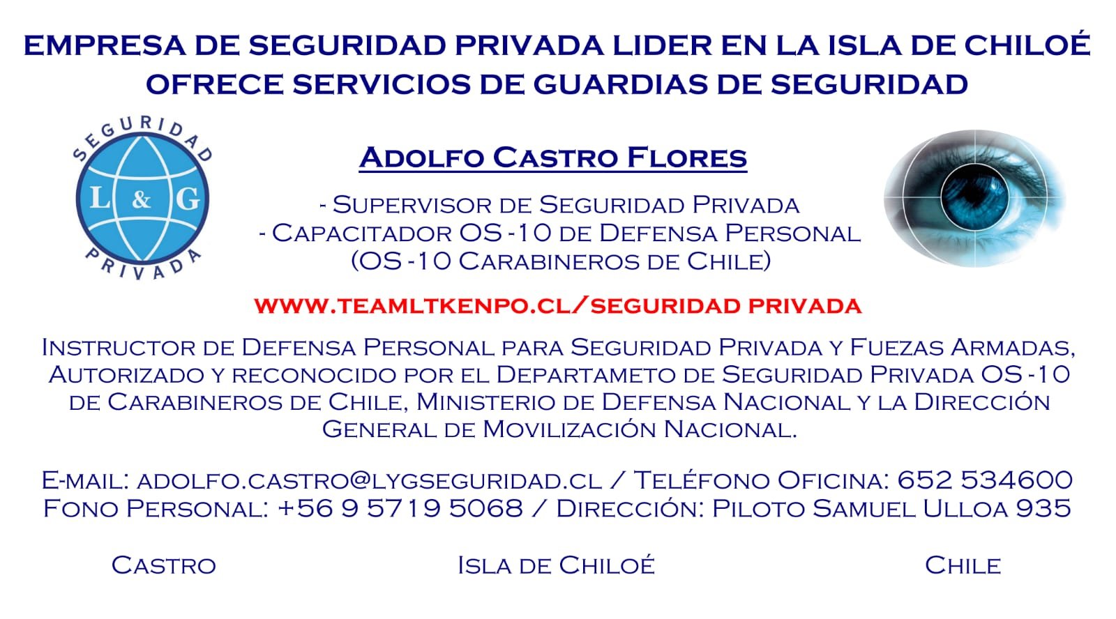 Adolfo Castro Flores es miembro activo en la actualidad (noviembre del 2023, con una antigüedad de cinco años) en la Empresa de Seguridad Privada LyG de Castro en la Isla de Chiloé como Instructor de Defensa y Protección Personal y Supervisor de Seguridad Privada.